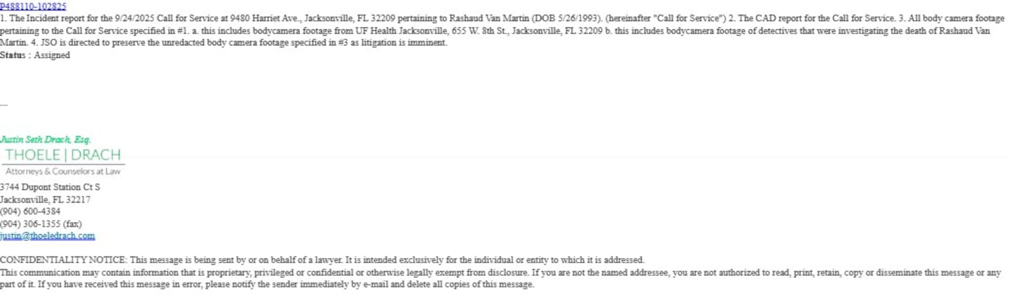 Drach says that before Action News Jax aired the news of Martin’s death, he had submitted a public records request to the Jacksonville Sheriff’s Office for body camera footage related to the incident.