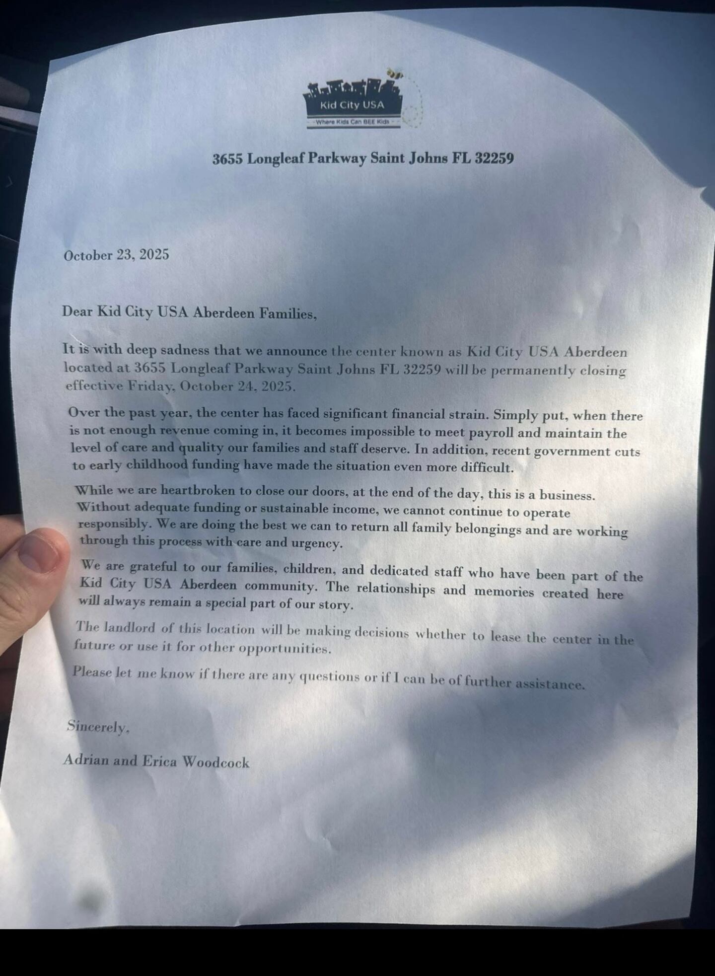 Action News Jax obtained a copy of the letter the owner of the Kid City USA daycare in Aberdeen sent out to families ahead of the closure. Part of it reads that “the center has faced significant financial strain,” and that “simply put, there is not enough revenue coming in.”