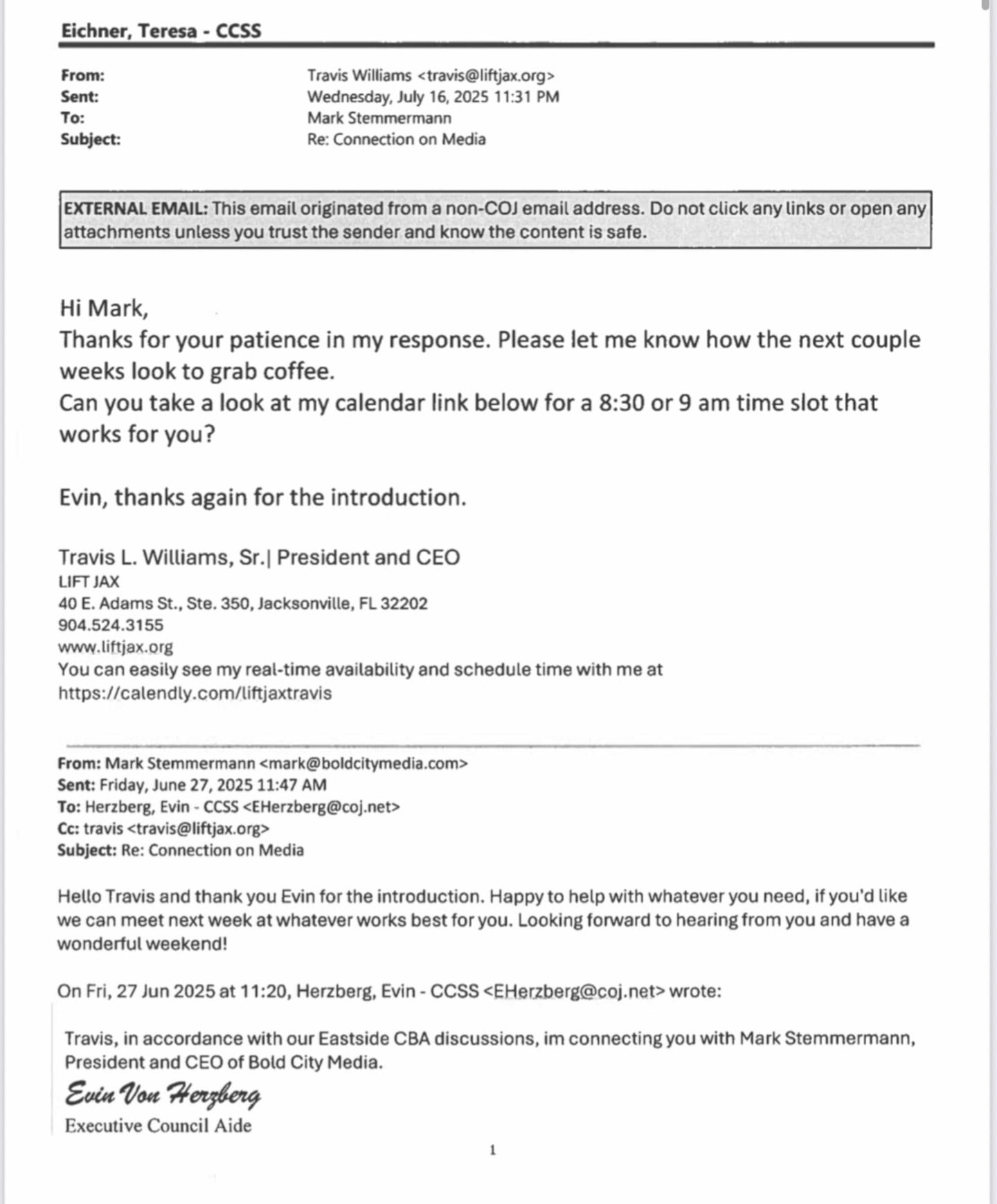 Action News Jax has now obtained an internal city email from June showing Arias’ assistant connecting LIFT JAX CEO Travis Williams with Bold City Media.