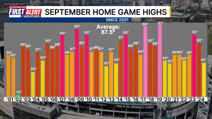 Jags home games avg. high temp. for each game day (so not a forecast, in other words!) @actionnewsjax @wokvnews @jaguars #FirstAlertWx pic.twitter.com/yQkntV86d2