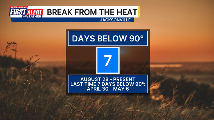 After weeks & months of 90-degree temps. in Jacksonville/NE Florida & SE Ga. (102 days in Jax so far), we’ve had a nice break from the heat thanks to days of winds blowing off the Atlantic (out of the east/northeast). The 7 days in a row below 90 degrees from Aug. 28-Sept. 4 was the longest stretch without a 90-degree day since late April & early May! The first day of autumn is officially Sept. 22. The record for 90 degrees days in a single year is 114 in 2011. We’re likely to end up short of 2025 becoming #1.