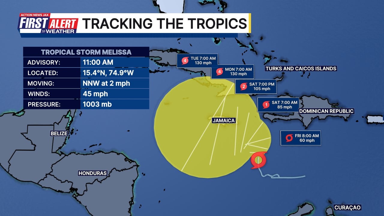 Very warm water temps. alone do not guarantee a “major” storm... other ingredients need to be favorable too. Right now shear out of the west at 20-30 mph has slowed Melissa’s organization: