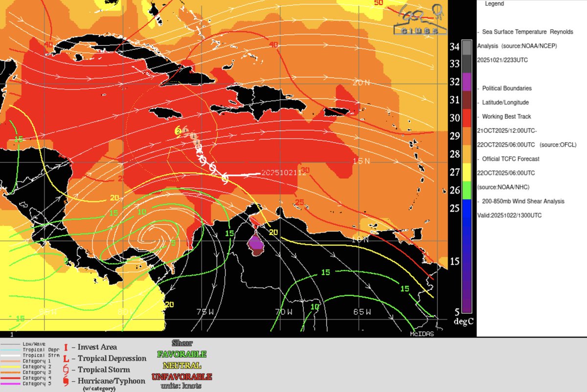 Very warm water temps. alone do not guarantee a “major” storm... other ingredients need to be favorable too. Right now shear out of the west at 20-30 mph has slowed Melissa’s organization: